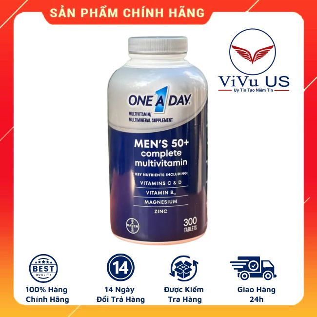 - Vitamin tổng hợp Vitamin tổng hợp One A Day Men’s 50+ là vitamin tồng hợp cung cấp hơn 20 loại vitamin + khoáng chất cần thiết cho nam giới để tăng cường sức khỏe, sinh lực, tăng năng lượng giúp hoạt động hiệu quả, đồng thời làm giảm nguy cơ mắc bệnh. Khách dùng phản hồi tầm 2 – 3 tuần trở lên là thấy hiệu quả.